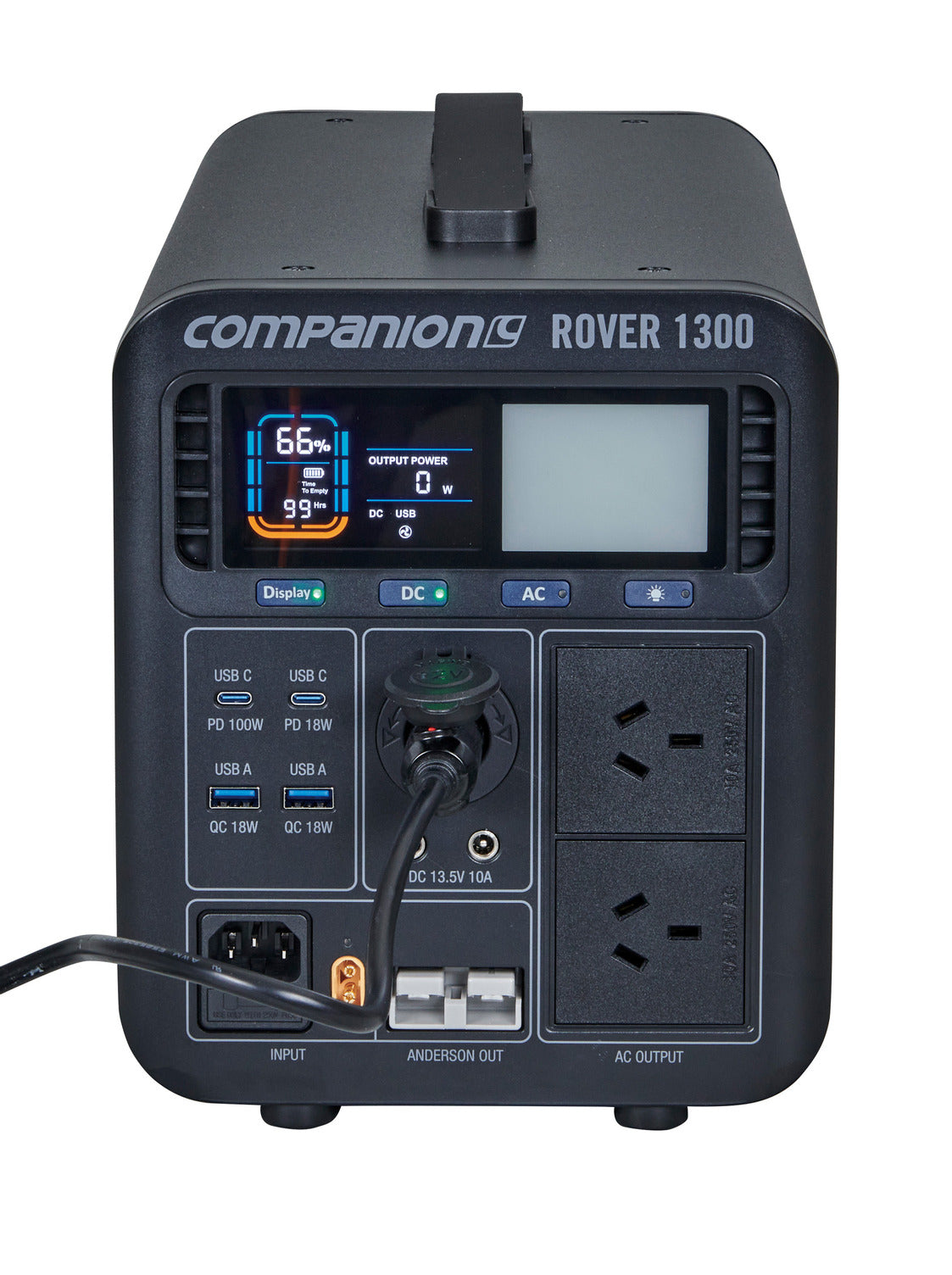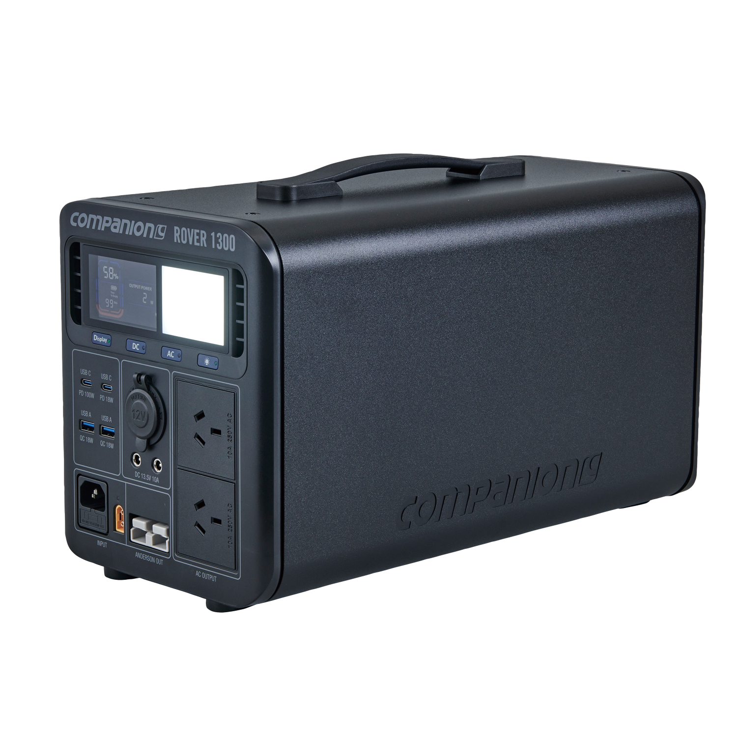 The Rover 1300w power station is Companion’s most powerful and feature packed portable power station perfect for camping and road trips. This is your ideal, portable indoor or outdoor power solution and is capable of following you anywhere you need fast, reliable power and lots of it! Powered by a lithium LiFePo4 battery, the Rover 1300 delivers an enormous 1344Wh or 105Ah (@12.8V). With a total of 10 outputs including Anderson and 2 independent AC ports, you can power almost any device and multiple devices at the same time.